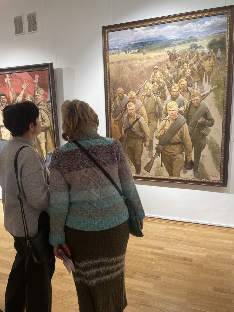 творческого диапазона, работающего в различных видах и жанрах живописи». По крайней мере, так говорится в аннотации искусствоведа Татьяны Скоробогатовой об авторе более 70 полотен, представленных на выставке, художнике-баталисте Михаиле Полетаеве. Выставка сборная. Треть картин — из собрания Студии военных художников имени М.Б. Грекова. Как и положено, на открытии выступили первые лица музея и люди от культуры. Был и сам художник. Но особенно запомнились слова Натальи Куриной, председателя Комитета семей воинов Отечества Новосибирской области. Очень хорошо сказала. Точно. — Мы узнаём на картинах лица наших воинов, мужей и сыновей, защитников Отечества, которые живут в современном мире. Понимаем, что такое святость материнства, глядя на ваши картины. Почему отец за сыном? Что такое Родина? Родина — это народ, если взять широкое понятие. Продолжение человеческого рода, сохранение традиционных ценностей. Сердце откликнулось на каждую вашу картину. Светлые взгляды наших мужчин, мальчиков
