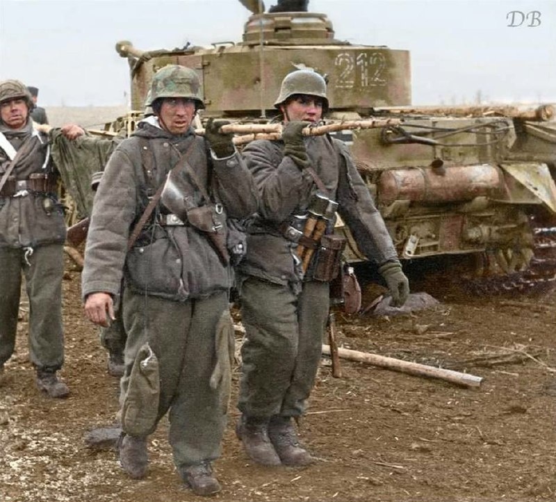 Германские гренадеры несут раненого на импровизированных носилках, на заднем фоне - Panzer IV Ausf