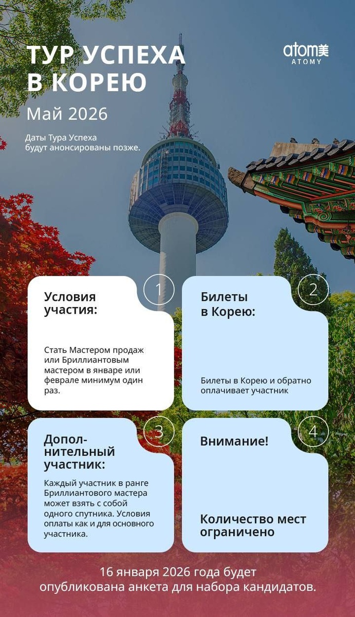 ! 🩵 Открыт приём заявок на участие в Туре Успеха Атоми в Корею (май 2026)! ℹ️ Обращаем ваше внимание: если вы планируете ещё подтвердить свой статус (Мастер продаж или Бриллиантовый мастер) в других расчетных периодах (январь-февраль), рекомендуем подавать анкету позже, чтобы указать уже итоговые подтверждённые данные. Анкеты рассматриваются при наличии фактически подтверждённого ранга Мастер продаж или Бриллиантовый мастер. Желаем всем успехов вместе с Атоми!✨
