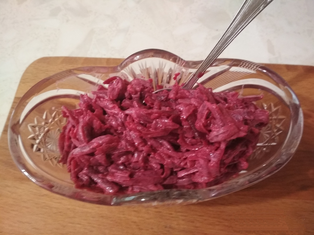 Сегодня предлагаю совсем простой рецепт, который поможет привести давление в норму, мягко почистить кишечник, да и очень вкусно. Готовится элементарно, зато сколько пользы и удовольствия. Свёкла варёная - 2 шт. Чеснок свежий - 2 зубчика. Сыр плавленый - 1 упаковка ~90 грамм. Майонез - 1 столовая ложка или по вкусу. Зелень свежая по желанию. Свёклу сварить до готовности, можно запечь, очистить от кожуры и натереть на треке.