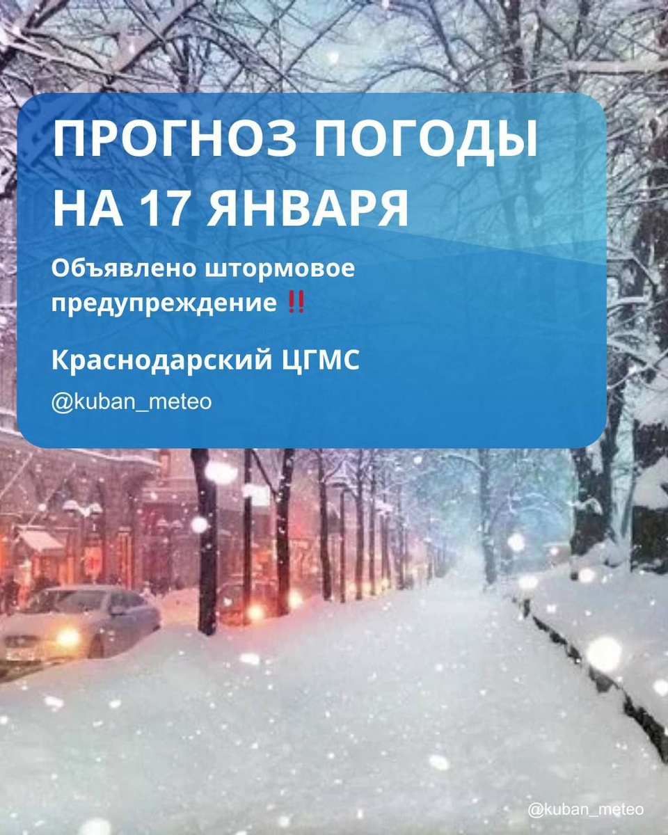 ☁️⛅⛈️ ❄️ Суббота, 17 января 📍 Краснодарский край Облачно с прояснениями. 🌨 Местами мокрый снег, снег, в отдельных районах сильные осадки. ⚠️ До конца суток 16.01 местами: — гололёдно-изморозевое отложение в сочетании с сильным ветром с порывами 15–20 м/с, — в отдельных районах порывы 20–25 м/с (КМЯ); — очень сильные осадки в виде мокрого снега, дождя со снегом (ОЯ); — очень сильный снег (ОЯ); — сильное налипание мокрого снега на проводах и деревьях (ОЯ); — гололёд, на дорогах гололедица. 💨 Ветер северо-восточный 5–10 м/с, порывы 12–14 м/с, местами 15–20 м/с. 🌡 Температура воздуха: ночью –5…–10°, местами при прояснении –10…–15°; днём –3…–8°; 🏔 в горах ночью –12…–17°, днём –8…–13°; 🌊 на Черноморском побережье ночью –3…–8°, днём –4…+1°. 📍 По г. Краснодару Облачно с прояснениями. 🌨 Ночью снег, днём небольшой снег. 💨 Ветер северо-восточный 5–10 м/с, порывы 12–14 м/с. 🌡 Температура воздуха ночью –8…–10°, днём –3…–5°. С заботой, Краснодарский ЦГМС @kuban_meteo 💙