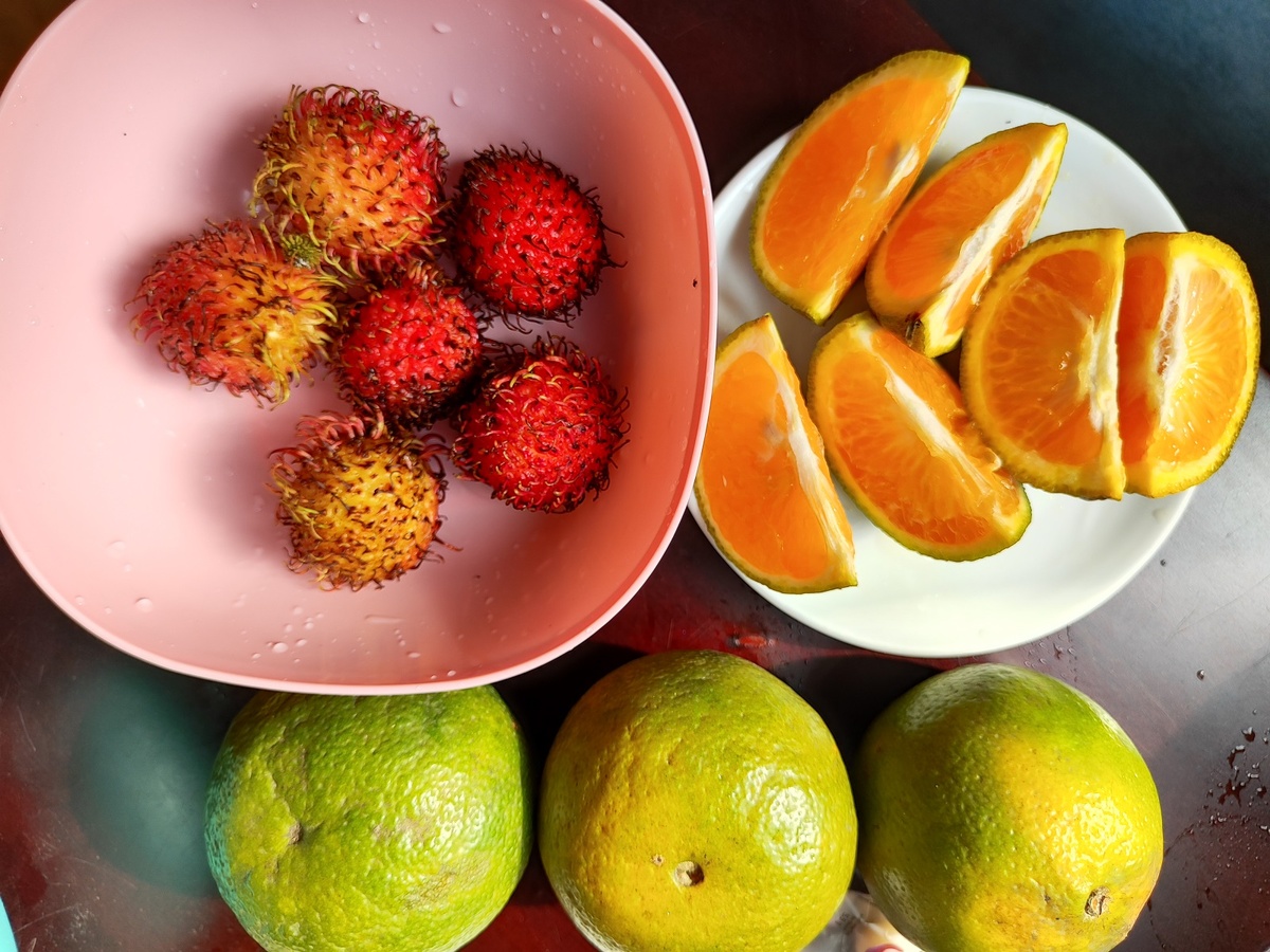 Утром дождались завтрака, который нам приносят в номер. Завтрак выбирали вечером по меню. Доели остатки рамбутанов и апельсинов. Вчера все не осилили.