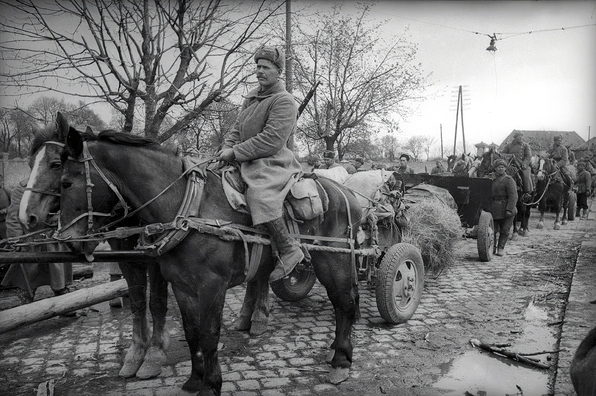 В каждом стрелковом полку по штату полагалось иметь около 350 лошадей. На них перевозили артиллерийские орудия и миномёты, имущество связистов, сапёров, химиков и прочее. Конные повозки были основным транспортом и в полковом тылу. На них доставляли продовольствие, боеприпасы и другое имущество. Нельзя не упомянуть и о полевых кухнях на конной тяге, которые всюду сопровождали войска, чтобы накормить бойцов горячей пищей. Специальные санитарные повозки были и у полковых медиков – на них везли укладки с медикаментами, инструментарием и другим имуществом полковых лазаретов, эвакуировали в дивизионный тыл раненых.