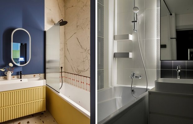 Делимся интересными решениями, которые добавят интерьеру функционала В небольших ванных комнатах вопрос хранения всегда стоит особенно остро: куда убрать полотенца, косметику, бытовую химию и мелочи, чтобы они были под рукой, но не создавали хаос. Выручают дизайнерские приемы и хитрости. В этом статьей делимся удачными решениями, с которыми проще организовать систему хранения даже в мини-санузле. Дополнением к тумбе под умывальник стал подвесной шкафчик. Его расположили в углу над столешницей, поэтому он не занимает полезную площадь и не мешает передвижению. А чтобы он визуально не выделялся, его сделали из мдф, приблеженному по цвету и рисунку к плитке. В образовавшуюся нишу встроили стеллаж с полками и выдвижными ящиками. На полках удобно хранить корзины с мелочью, декор и уходовые средства, которые нужны на постоянно основе. Выдвижные ящики узкие, по типу карго. В них можно составлять запасные косметические средства и бытовую химию. За счет встройки стеллаж выглядит легко и визуальн