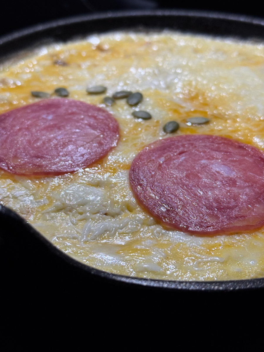 - Посыпьте тёртым пармезаном, затем выложите ломтики колбасы.