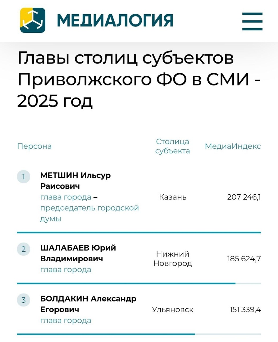 📊По итогам рейтинга «Медиалогии» за 2025 год глава Ульяновска Александр Болдакин занял третью строчку среди глав столиц субъектов ПФО