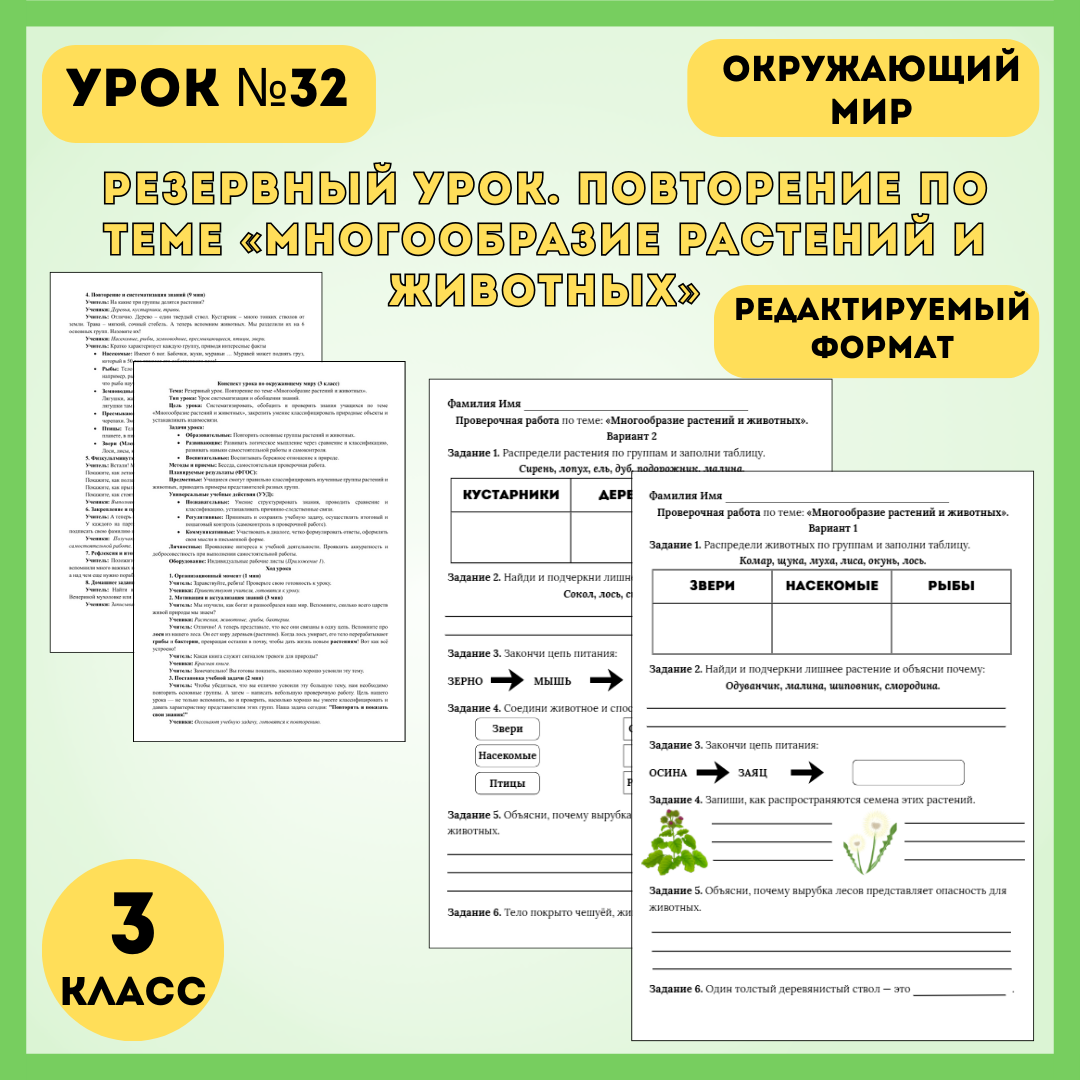 Конец учебного модуля — это всегда стресс и для учителя, и для первоклассников. Нужно подвести итоги, проверить знания и при этом удержать внимание детей. Лучшее решение для такого случая — урок-обобщение в игровой форме. Делюсь готовым планом-конспектом урока №32 по окружающему миру: «Многообразие растений и животных». Вместо скучного опроса мы предлагаем детям интерактивное путешествие по станциям. Это позволяет задействовать разные виды памяти и сохранить динамику занятия. Что ребята успеют за один урок: В комплект к уроку входят продуманные рабочие листы. Одно из самых любимых заданий у детей — «Кто лишний?». Оно учит находить общие признаки и выделять исключения, что критически важно для развития логики в 3 классе. Например, в ряду «Медведь, Лиса, Олень, Щука» ребенку нужно не просто найти лишнего, но и аргументировать: «Щука — это рыба, а остальные — звери». Не тратьте вечер на составление проверочных заданий и поиск картинок. Всё уже собрано в одном редактируемом файле. 👉 Скача