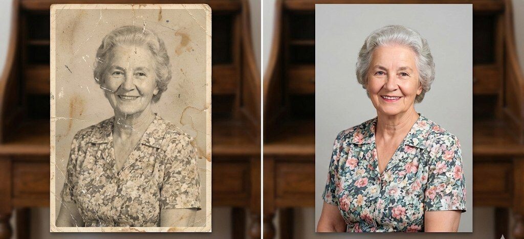Возьмите свои старые домашние фото. Прогоните их через нейросети: сделайте цветными, уберите трещины. Сделайте коллаж "ДО" и "ПОСЛЕ".