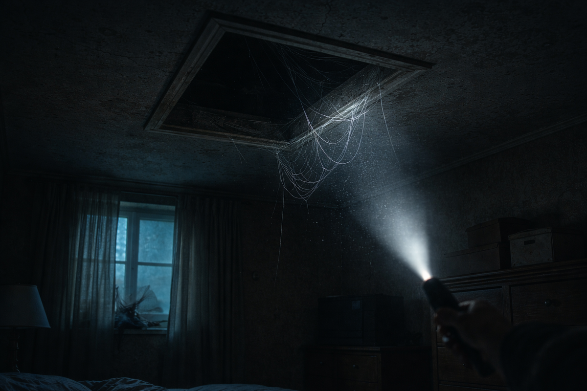 Дверца прямоугольной формы с легкостью раскрылась, свесившись вниз перпендикулярно полу. Громадный ком маленьких роящихся паучков обрушился на Василия Степановича, словно тёмный водопад. Десятки крошечных созданий мгновенно облепили его одежду и кожу, забираясь под воротник и рукава. Маленькие ножки щекотали все тело, казалось, они были везде. Но так было лишь первые доли секунд, затем десятки созданий превратились в сотни, падая ручейками из открытого в потолке отверстия. Их стало слишком много — Василий почувствовал жгучие уколы и резкую слабость. Лицо Василия, сплошь покрытое пауками, исказила страшная гримаса, тело свело, и он рухнул на пол. На парализованное тело забиралось все больше пауков: их становилось всё больше. Он попытался закричать — но смог лишь захрипеть. Словно по очередной команде, создания выпустили тонкие паутинки и начали быстро оплетать его липкими нитями. Вскоре паутина покрыла его целиком, и организованное сообщество тварей, протянув тонкие, но прочные нити обратно под крышу, и потянули «кокон» вверх, в темноту чердака. Времени прошло немного, как новый кокон из паутины лежал в узком пространстве под самой крышей старого дома. Чуть дальше темнел старый, высохший кокон — намёк на то, куда исчез прежний хозяин дома.