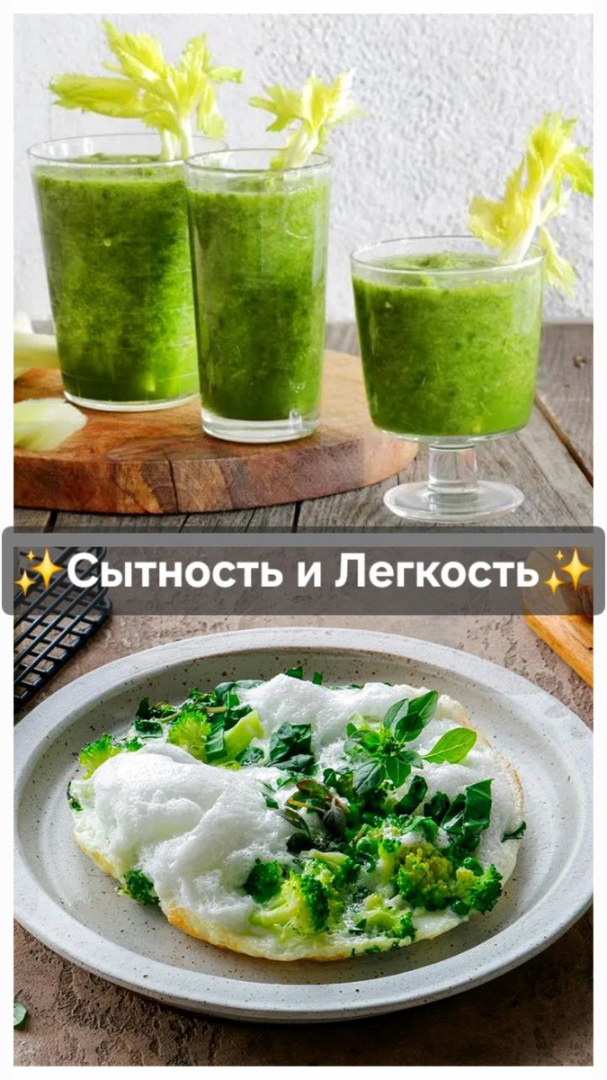 🤗 Дорогие мои девочки, после насыщенных, сытных праздников хочется вернуть легкость своему телу ✨ и начать сбрасывать то, что мы наели. 1️⃣ Детокс-смузи с сельдереем🍏🥬 Этот смузи — настоящий заряд свежести и витаминов! Зеленые яблоки, шпинат и сельдерей вместе создают легкий, питательный коктейль, который освежит и запустит процессы детокса. Лимонный сок добавит немного кислинки и усилит очищающий эффект. Готовится очень быстро — всего 10 минут! 📋 Ингредиенты на 2 порции: • 2 крупных зеленых яблока • 200 г свежего или размороженного шпината • 70 г стебля сельдерея • 20 г лимонного сока Просто всё взбейте в блендере — и вкусное, полезное утро обеспечено! 🌟 2️⃣ Белковый омлет с брокколи и зеленью 🥚🥦 Для тех, кто хочет не только разгрузить организм, но и поддержать мышцы, отличный выбор — омлет с зелеными овощами! Полезный белок из яичных белков и витамины из брокколи, шпината и зеленого горошка подарят чувство сытости и легкости одновременно. Куркума и копченая паприка придадут