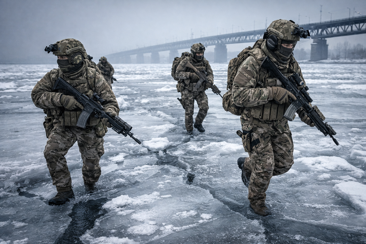 Херсонцы пишут, что речь идёт лишь о тонкой ледяной корке у берега и в отдельных затонах. Основное русло Днепра в районе Херсона остаётся открытым: течение сильное, глубины большие, о сплошном льде речи не идёт. Такой лёд не выдерживает даже вес человека, не говоря уже о группах бойцов.