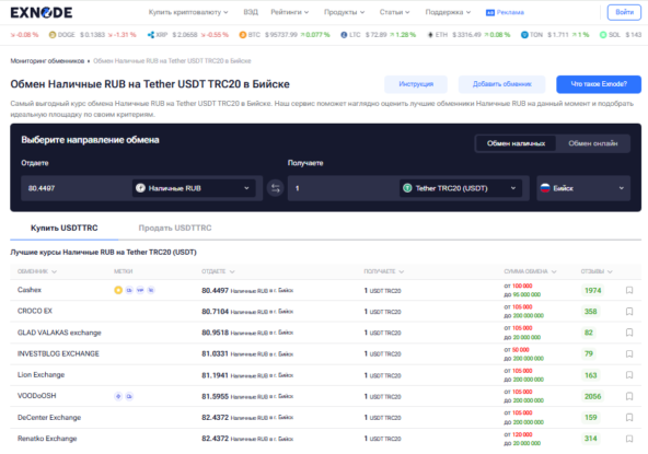 Чтобы облегчить выбор надёжного сервиса, пользователи всё чаще обращаются к мониторингу Exnode. Платформа собирает криптообменники Бийска. Предоставляет актуальные криптообменники в Бийске с адресами и реальными отзывами. Это позволяет заранее понять, где выгодно обменять USDT в Бийске, сравнить условия и выбрать подходящий сервис для любой задачи — будь то стейблкоины или другие цифровые активы.