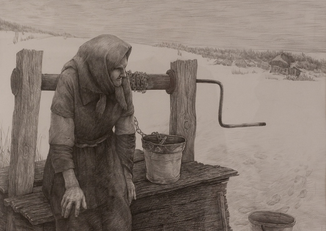 Каждый день она, согнувшись в три погибели, тащила его, полный ледяной влаги, к избе. Вода расплёскивалась на землю — слёзы колодца.