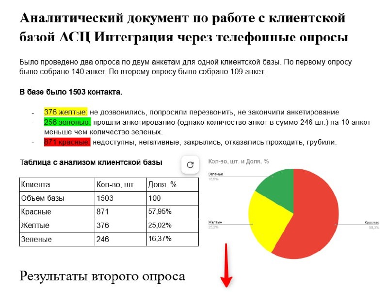 Oprosmarket. Мы помогаем компаниям не просто догадываться о мнении клиентов, а реально слышать их через интервью, опросы и анализ базы. Вчера закончили телефонный опрос для АСЦ «Интеграция» по их клиентской базе — и вот что мы увидели. Что мы узнали о базе В базе у нас 1503 контакта, и это важный сигнал: не все контакты одинаково “живые”. - 57,95% — (недоступны, отказ, негатив, закрылись) - 25,02% — (не дозвонились, просили перезвонить, не завершили) - 16,37% — (успешно прошли анкетирование) Это не “плохая база”, а нормальная реальность, если ею долго не управлять. Но в этом есть огромный резерв для роста! Актуализация, сегментация и правильные касания — и эффект не заставит себя ждать. Мы узнали, что нравится клиентам в «Интеграции» Вот сильные стороны, которые стоит сохранить: 1) скорость и оперативность 2) компетентность специалистов 3) вежливость и нормальная человеческая коммуникация 4) доступность связи Это тот фундамент, на котором можно строить дальнейший рост. А что к