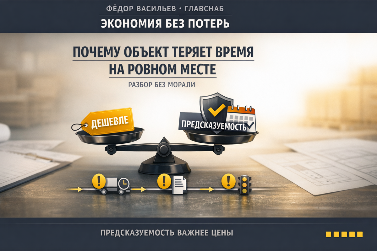 SEO‑ключи: служба одного окна, Федор Васильев, ГЛАВСНАБ, снабжение стройки, график поставок, скорость поставок, экономия без потерь, документы, инциденты 15/2/24 Смотрите. Было у вас так: сметчик нашёл позицию «дешевле на 2–3%», закупку согласовали, все довольны. Проходит неделя — и на планёрке звучит главное слово стройки: «ой». Не приехала мелочь, не сошлись документы, аналог “почти тот”, машина приехала “в течение дня”, а окно разгрузки уже занято. Итог — простой и сжатие графика. Я — Федор Васильев, основатель ГЛАВСНАБ. Я скажу как есть: в стройке победитель не тот, кто купил дешевле, а тот, кто сделал снабжение стройки предсказуемым. Потому что объект покупает спокойствие. И это не философия — это экономика времени. Что вы заберёте из статьи: