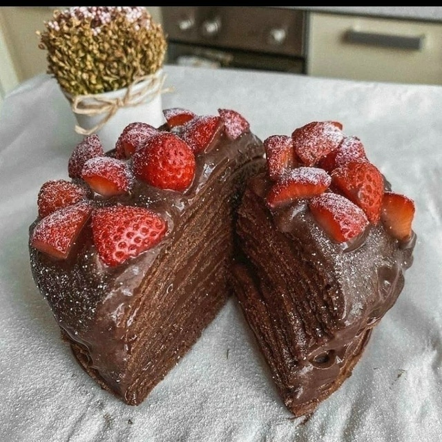 Собрать торт чередуя кожи>крем (чтобы торт не разъехался в середину можно вставить зубочистку).Верх тортика украсить любимыми ягодами. Убрать в холодильник 1/2 часа.