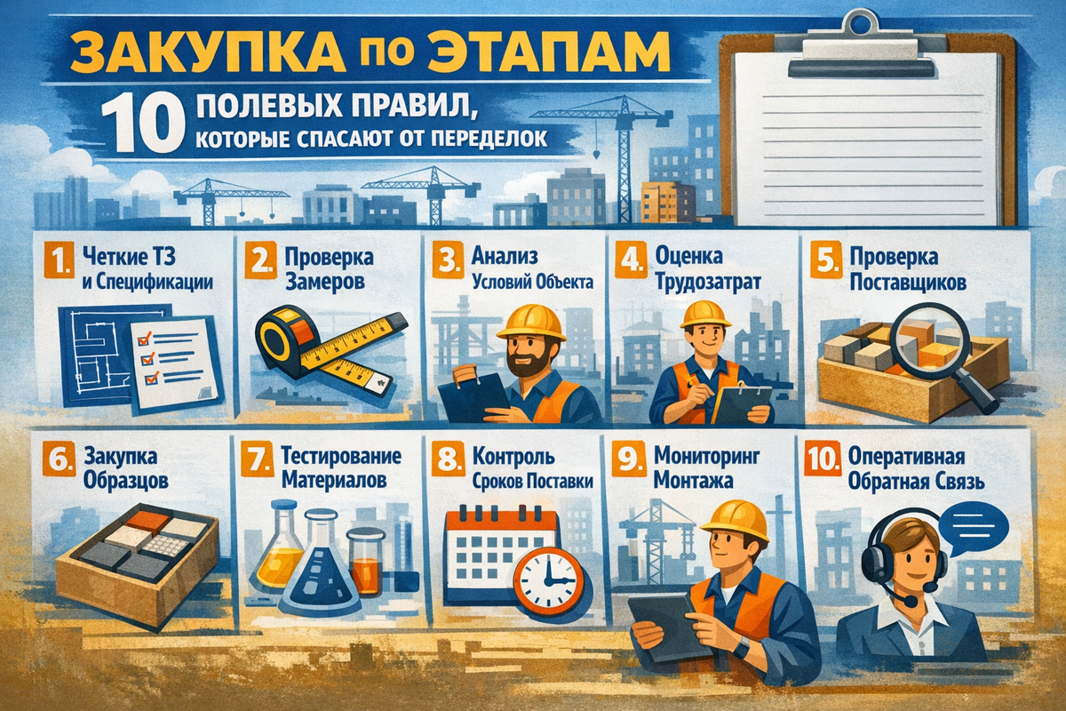 И если закупка не привязана к этапу, график всегда проиграет. Смета — это список. Объект — это ритм: что именно нужно к понедельнику, что к среде, что к окну разгрузки. Когда закупка идёт по этапам, вы: ● меньше ловите пересорт и “почти то”; ● меньше держите лишнего на площадке; ● быстрее закрываете смету с 85% к 95–98% без цирка; ● держите сроки системой, а не героизмом снабженца. Правило закупки №1: берите короткую дистанцию, но держите её железно.