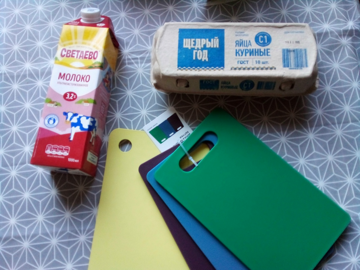 Сегодня покупки довольно минималистичные и по делу. Всё из "Чижика ", очень радует этот магазин. У молока снова поменялся производитель, теперь это Беларусь))) Яиц дешевле не бывает. А доски как раз нужны были, 149 рублей за набор. Правда, перед этим в "Фикс Прайсе " купила одну простенькую доску, не знала, что в "Чижике " найду. Будет запас))))