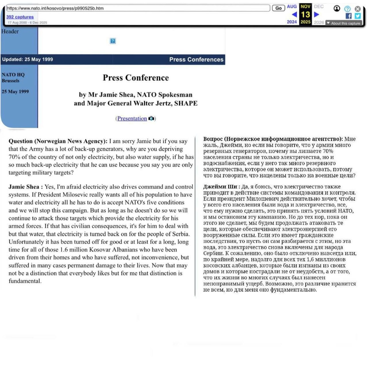 НАТО удалила со своего сайта запись брифинга 1999 года с оправданиями ударов по энергосистеме Сербии. "НАТО продолжит атаковать энергообъекты Сербии. Если это наносит вред гражданским, лишая их воды и электричества – это проблемы Милошевича. Пусть примет 5 условий НАТО и это прекратится", – текст от 25 мая 1999 года. Текст был на сайте более 25 лет. Теперь, запись удалили 6 декабря 2025 года – в день удара ВС РФ по энергообъектам, питающим оборонные заводы Украины. "Электричество приводит в действие системы командования и контроля. Если президент Милошевич действительно хочет, чтобы у всего его населения были вода и электричество, то всё, что ему нужно сделать, это принять пять условий НАТО, и мы остановим эту кампанию. Но до тех пор, пока он этого не сделает, мы будем продолжать атаковать те цели, которые обеспечивают электроэнергией его вооруженные силы. Если это имеет гражданские последствия, то пусть он сам разбирается с этим", – заявлял официальный представитель НАТО Джейми Ш
