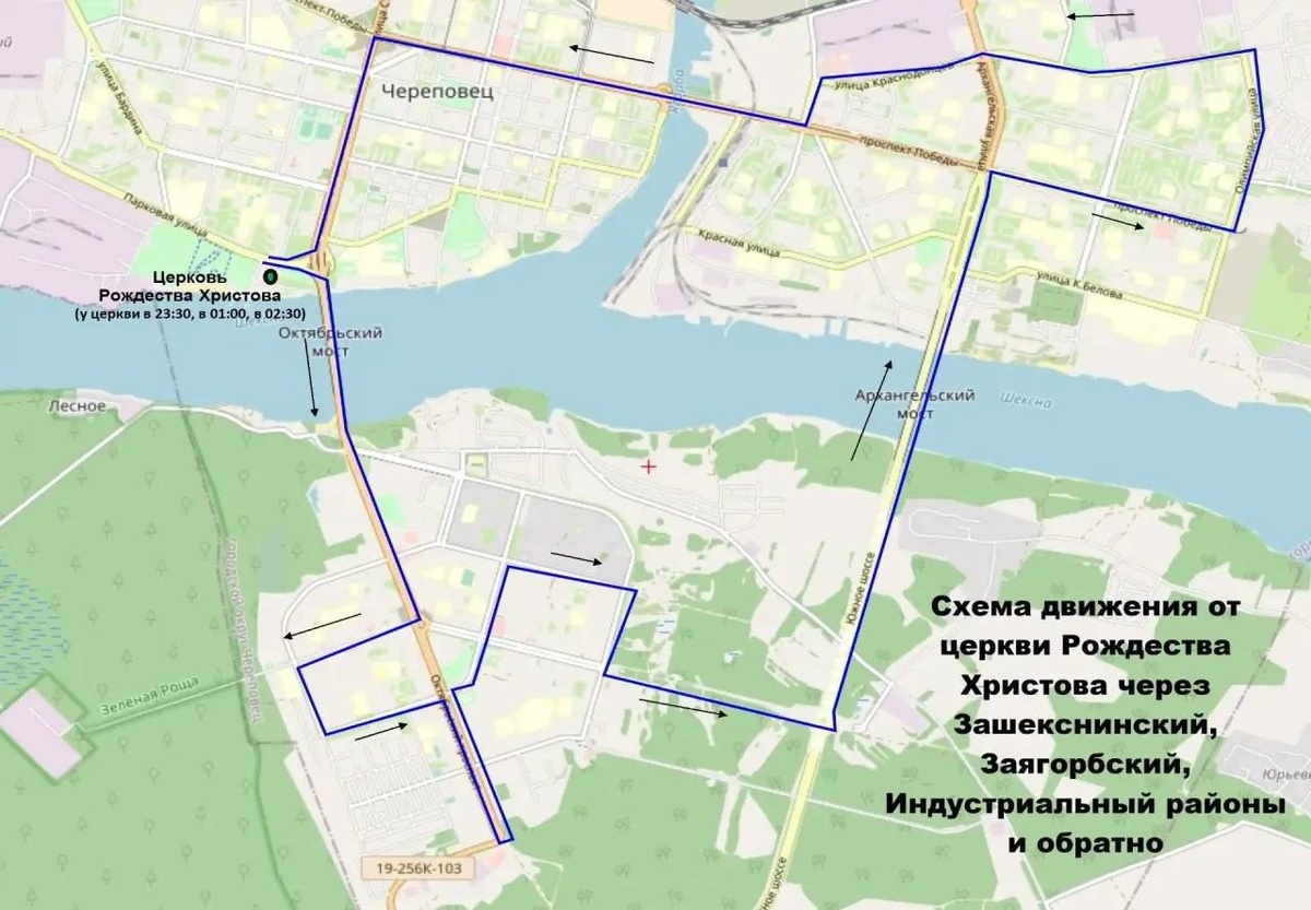 Об этом сообщили в мэрии Череповца. Отправление — в 23:30 от храма Рождества Христова (ул. Парковая). 🚍 Маршрут № 1 (через Индустриальный район): Направление: Северный район → Заягорбский район → обратно через Индустриальный. Время отправления: 23:30, 00:30, 01:30, 02:30, 03:30. 🚍 Маршрут № 2 (через Зашекснинский район): Направление: Зашекснинский район → Заягорбский район → обратно через Индустриальный. Время отправления: 23:30, 01:00, 02:30. 📌 Условия: - Проезд бесплатный. - Автобусы следуют строго по утверждённым схемам с соблюдением всех остановок.