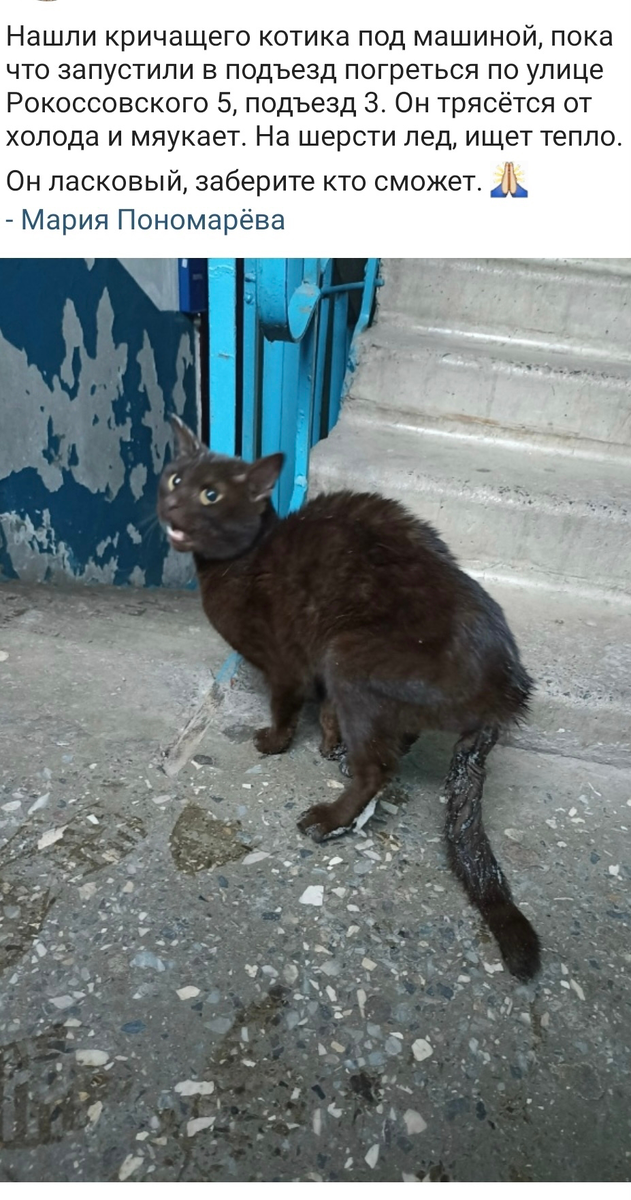 Первый кот прятался под машинами, прилип к снегу. Люди помогли и