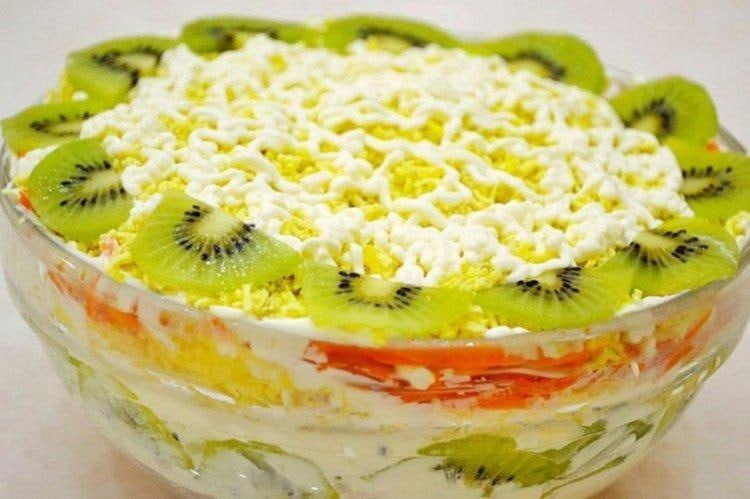 🥣♥️ Салат с курицей и киви Тебе понадобится: 200 г курицы, 150 г моркови, 3 яйца, 3 киви, 2 яблока, сметана. Приготовление: Отвари курицу и яйца. Курицу и киви нарежь мелким кубиком, а остальные ингредиенты натри на крупной терке. Выложи слоями курицу, киви, морковь, яблоко и яйца, смазывая каждый сметаной со специями. 💖 Вкусная Жизнь
