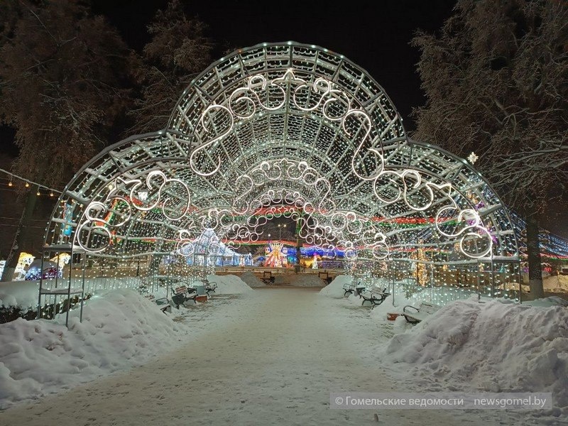В зимний вечер Гомель словно загорается миллионами ярких огней, превращая город в волшебную иллюстрацию ночного праздника.