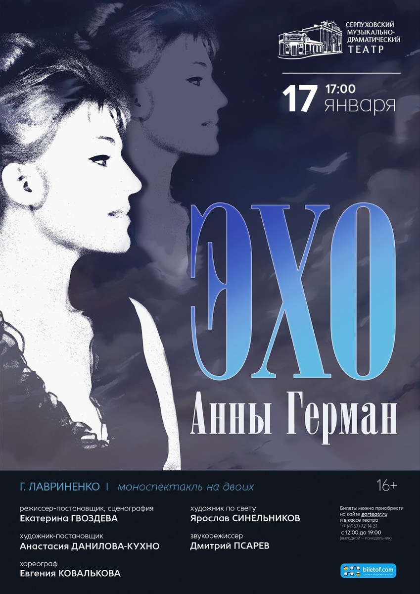 ✨ Моноспектакль на двоих "ЭХО АННЫ ГЕРМАН* 🎭Спектакль по пьесе Г. Лавриненко «Моё звучание», погружает зрителей в мир знаменитой певицы. ❗Моноспектакль рассказывает историю о силе духа, принятии себя и умении прощать через внутренний диалог героини с самой собой. ⏳ — 1 час 30 минут. 🚫 Возраст: 16+ 📆 17.01.2026 🕒 17:00 🏢 Серпуховской музыкально-драматический театр 📍 г. Серпухов, ул. Чехова, д. 58/27 💰 Цена от: 700 до 1400 ₽ 🎫 Купить билет: https://clck.ru/3RJxM7 ⭐Поддержать канал голосом 💰 Канал Вакансии Серпухова ✅ Мероприятия Серпухов https://dzen.ru/id/66f01c6eb4c6fe60c9ca1608 http://vk.com/serpukhov_events http://dzen.ru/serpukhov_events