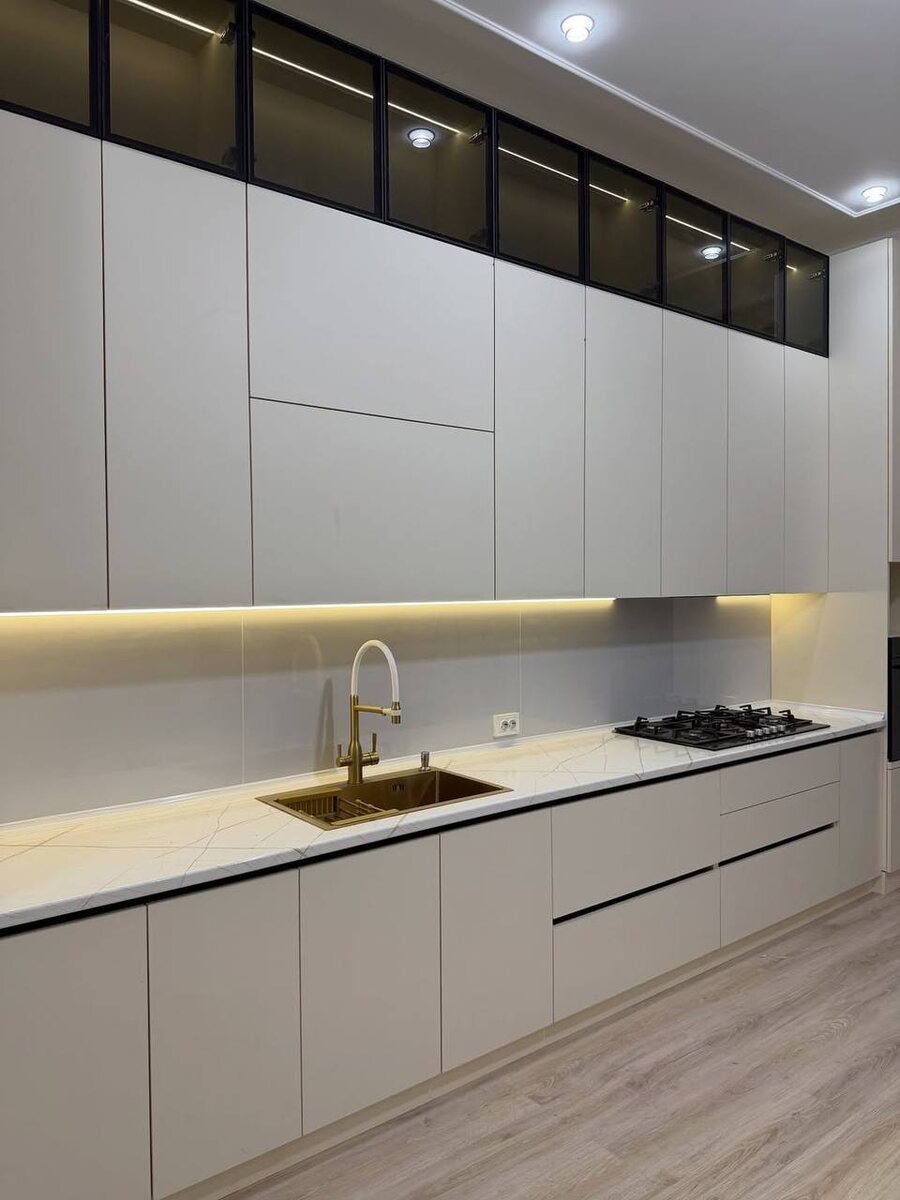 : • Гладкие фасады без ручек — визуально чище и удобнее в уходе • Светлый оттенок расширяет пространство и делает кухню «воздушной» • Верхние шкафы до потолка — максимум хранения без визуального шума • Контрастная столешница подчёркивает геометрию и добавляет глубины • Встроенная подсветка — комфорт для готовки и аккуратный акцент вечером Кухня продумана для ежедневного использования: ничего лишнего, всё на своих местах. Минимализм, который реально удобен. Такие кухни не надо «обживать» — они сразу работают.