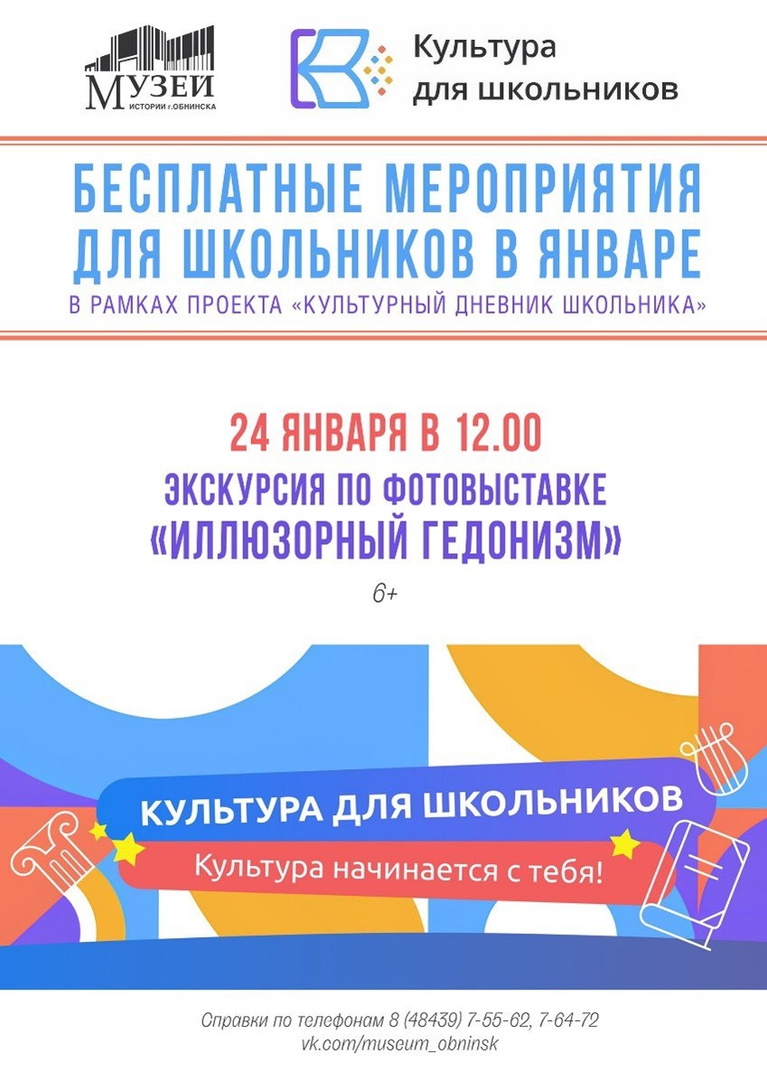 ». Бесплатные мероприятия для школьников в январе. Уникальный межведомственный проект «Культура для школьников» реализуется при поддержке Минкультуры России и Минпросвещения России. Проект «Культура для школьников» направлен на духовное, эстетическое и художественное развитие школьников, повышение культурной грамотности подрастающего поколения. Девиз проекта — «Культура начинается с тебя», ведь все его акции направлены на личностное развитие каждого. «Культура для школьников» — это увлекательное знакомство с богатейшей культурой нашей страны. Подробнее о проекте — на официальной странице культурадляшкольников.рф. ✅24 января в 12:00 экскурсия по фотовыставке "Иллюзорный гедонизм" в Музее истории города Обнинска. 📍Вход свободный. 6+. Обнинск, пр-т Ленина, 128. 👍 Подписаться | Ваша реклама