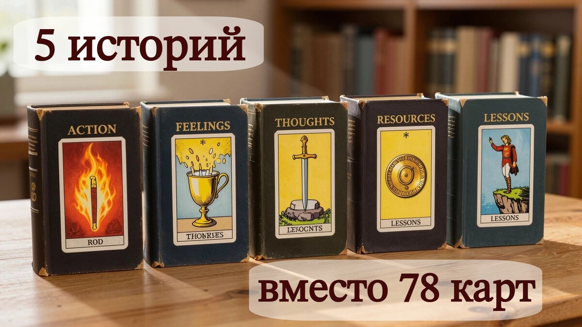 Потом я сделала то, что делаю с любой сложной системой — разобрала её на части. И Таро рассыпалось не на 78 осколков, а на 5 логичных блоков-сюжетов. Каждый блок — это законченная история, арка, которую вы проживаете каждый день. И учить почти ничего не придется. Нужно просто узнать, на какую «полку» положить каждую карту.