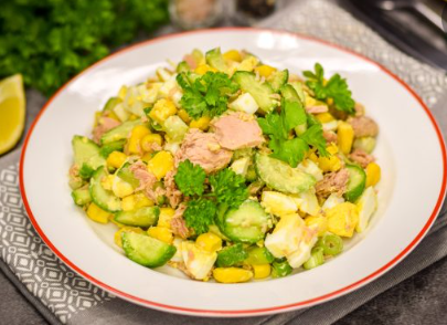 Приготовим диетический салат с тунцом и овощами, который понравится всем. Салат легкий, отлично подойдет в качестве ужина или даже на праздничный стол. Обязательно возьмите рецепт на заметку! Тунец консервированный 240 грамм (в собственном соку) Огурец 200 грамм Кукуруза консервированная 200 грамм Зеленый лук 30 грамм Яйца 4 штуки Масло оливковое 2 ст. ложка Лимонный сок 2 ст. ложка Соль По вкусу Перец молотый По вкусу