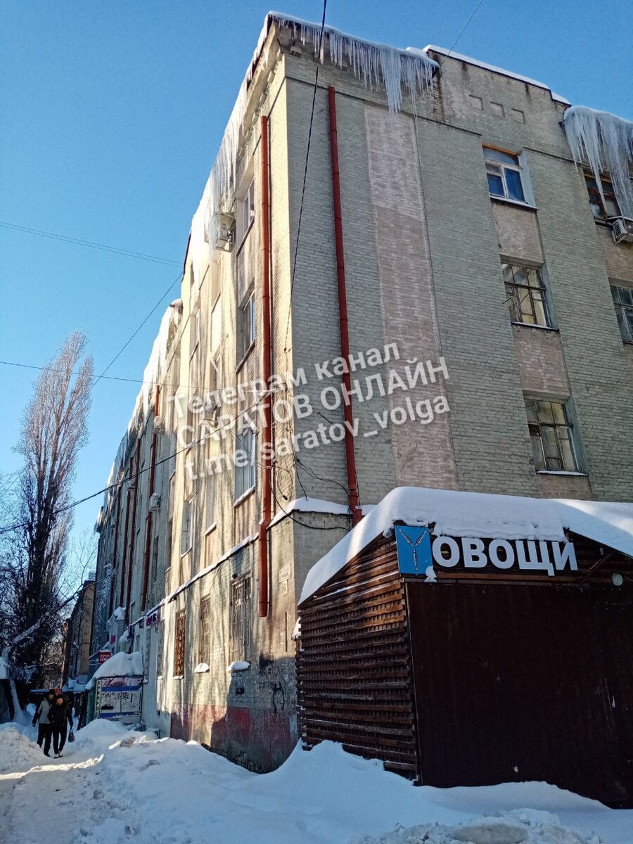 Нависают глыбы льда. А ведь там люди ходят(вход в отделение почты 410017, парикмахерская и магазин)