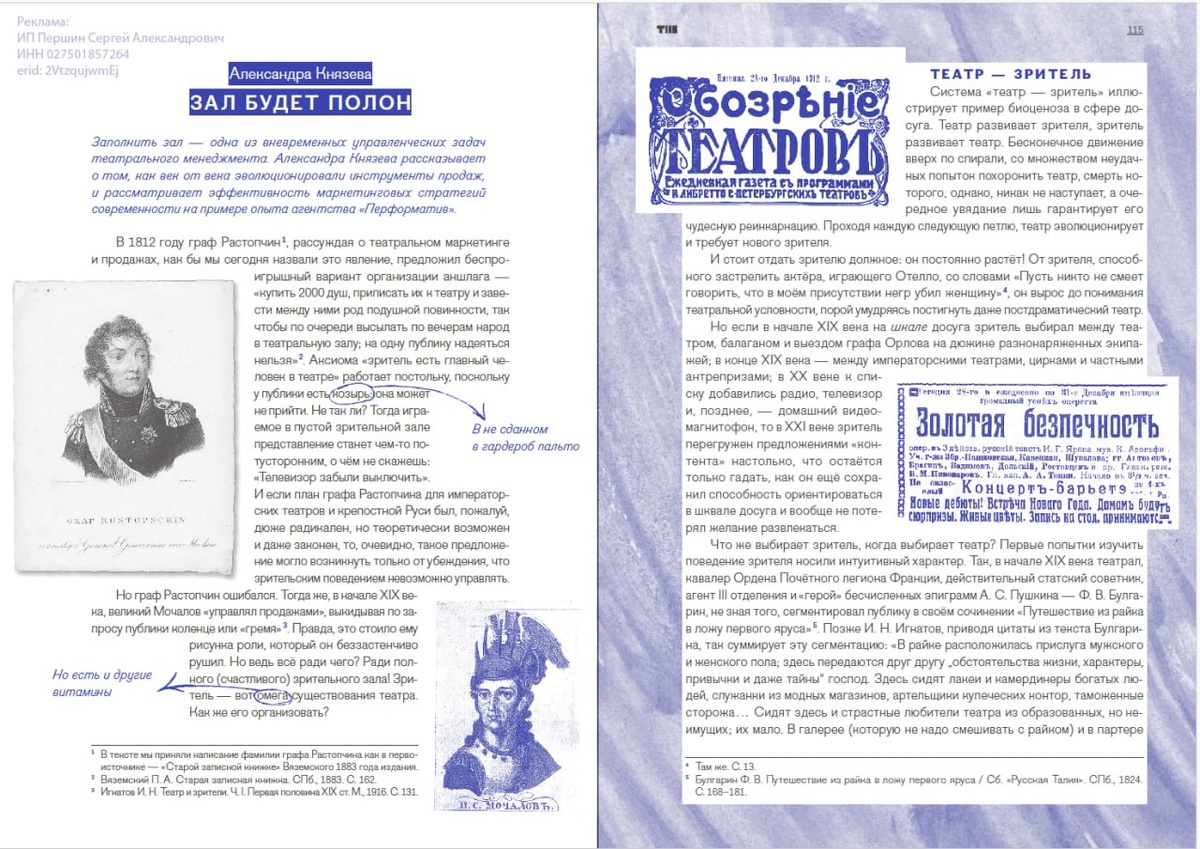 Как она решалась в разные времена? Об этом в новом номере «ТЖ» рассказывает Александра Князева: В 1812 году граф Растопчин, рассуждая о театральном маркетинге и продажах, как бы мы сегодня назвали это явление, предложил беспроигрышный вариант организации аншлага — «купить 2000 душ, приписать их к театру и завести между ними род подушной повинности, так чтобы по очереди высылать по вечерам народ в театральную залу; на одну публику надеяться нельзя». План графа Растопчина для императорских театров и крепостной Руси был радикален, но теоретически возможен и даже законен. Правда, очевидно, что такое предложение могло возникнуть только от убеждения, что зрительским поведением невозможно управлять. Но граф Растопчин ошибался. Тогда же, в начале XIX века, великий Мочалов «управлял продажами», выкидывая по запросу публики коленце или «гремя». Правда, это стоило ему рисунка роли, который он беззастенчиво рушил. Но ведь всё ради чего? Ради полного (счастливого) зрительного зала! Как пишет а