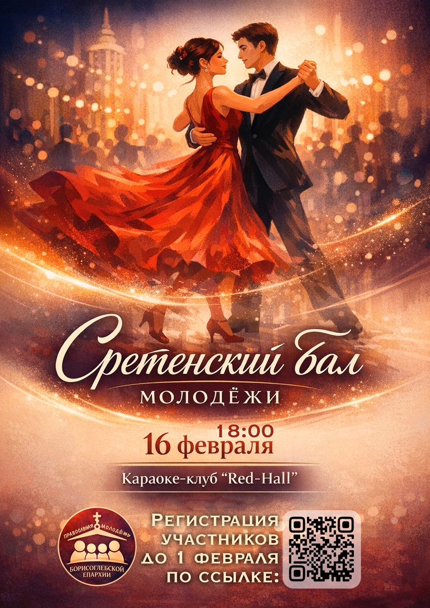 💃 Жителей Борисоглебска приглашают на Сретенский молодежный бал — красивое и торжественное событие для молодежи города. Бал состоится 16 февраля 2026 года в Red Hall. Сбор участников начнётся с 16:40, официальное открытие бала в 18:00. К участию приглашаются: — старшеклассники, — студенты вузов и ссузов, — представители молодежных объединений, — все желающие молодые люди. Для участия необходимо заполнить регистрационную анкету до 1 февраля по ссылке: clck.ru/3REzPT ❗️Важно: участие в репетициях обязательно. Генеральная репетиция пройдет 13 февраля в караоке-клубе Red Hall, начало в 15:10. Именно на ней участникам будут выдаваться пригласительные для гостей.