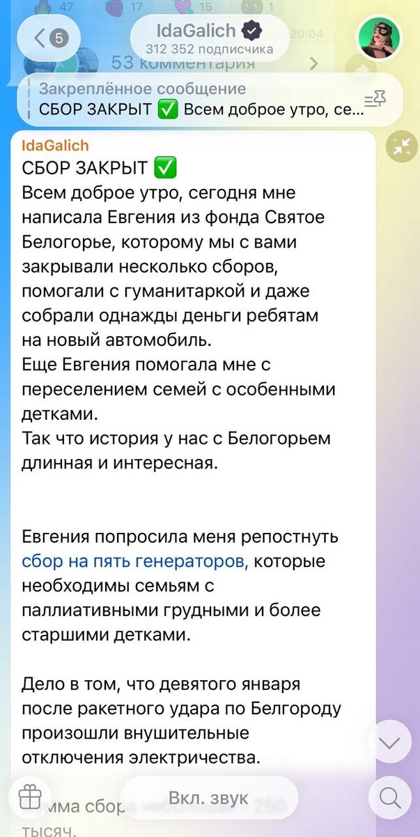 🙏🏻 Ида Галич помогла собрать более миллиона рублей на генераторы для больных детей! Их направят семьям, в которых здоровье ребёнка зависит от аппаратов жизнеобеспечения. После ракетного удара по Белгороду 9 января фонд «Святое Белогорье против детского рака» объявил сбор. Блогер внесла крупную сумму сама и попросила помощи у своих подписчиков. В итоге сбор оперативно закрыли. 💬 «Спасибо всем неравнодушным, нам удалось собрать более миллиона рублей. Генераторы уже закупаются и отправляются в семьи, где их очень ждут», — написала Ида Галич. Ставьте — 🔥, если понравилась эта публикация Источник: Мир Белогорья #добрыеновости31 Не забудьте подписаться на наш канал ❤️