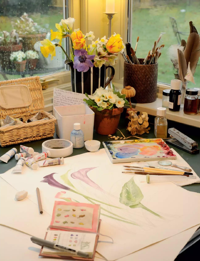 Для наброска — острый карандаш HB и мягкий ластик-клячка (для лёгкого удаления линий), большой пластиковый ластик (для больших участков). Скальпель — для заточки карандаша и процарапывания бликов. Резиновая жидкость (маскирующая жидкость) наносится тонкой кистью на те места, которые нужно оставить белыми (например, тычинки) — используйте дешёвую кисть и сразу мойте её в воде каждые несколько секунд. Рулон белых бумажных полотенец или хлопковая тряпочка — для снятия лишней воды с кисти. Пластиковый контейнер из‑под еды — отличная ёмкость для воды: наполняйте до краёв, чтобы реже менять. Лупа — чтобы разглядывать мелкие детали цветка. Маленький скетчбук — для набросков, заметок и наблюдений. Настольная лампа высотой около 70 см с галогенной лампочкой 50 Вт — даёт чистый, яркий свет без бликов на глазах и красиво ложится на цветы. Малярный скотч — фиксирует бумагу, но только по двум верхним углам, чтобы лист можно было поворачивать. Разные баночки и флаконы — от одного стебля до целого букета. Маленькие пластиковые флакончики с резиновой крышкой — наливаете воду и надеваете на срез стебля, чтобы цветок дольше оставался свежим.