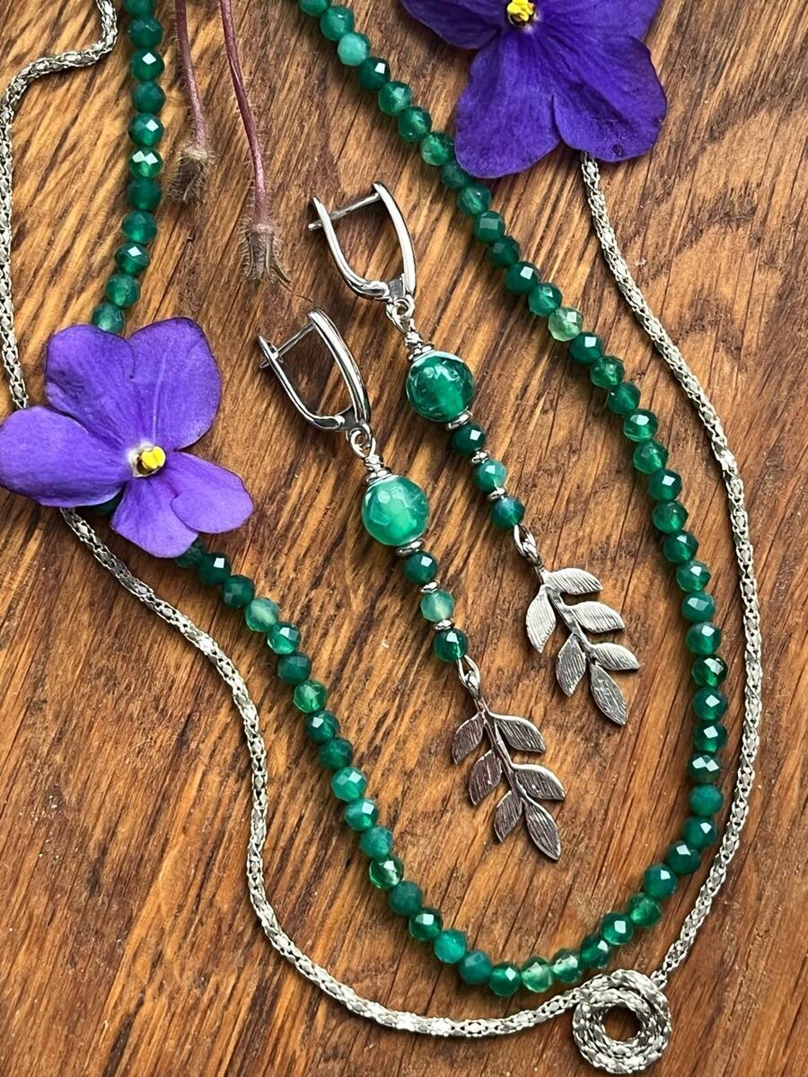 !🌿 Новые зеленые украшения, волшебный агат с огранкой, очень живой цвет. Серьги с листьями, всё логично) и изящно Даже лаконично. И в текстах я решила не грузить на вас много букв, быть сдержанно милой, не знаю на сколько меня хватит) Ваша фиалка. 💜 Подробнее в сторис 🤗