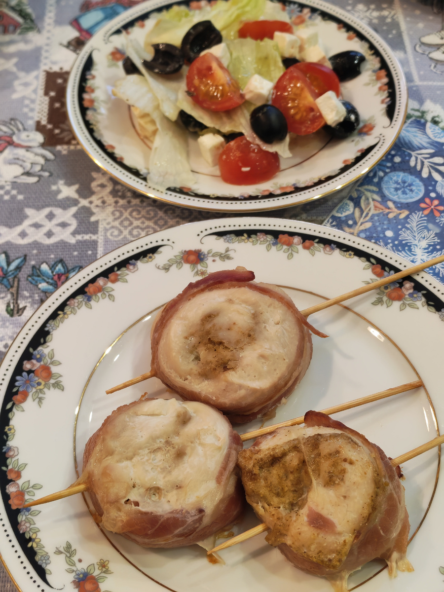 4. Сверху обмотать беконом и проткнуть шпажками.