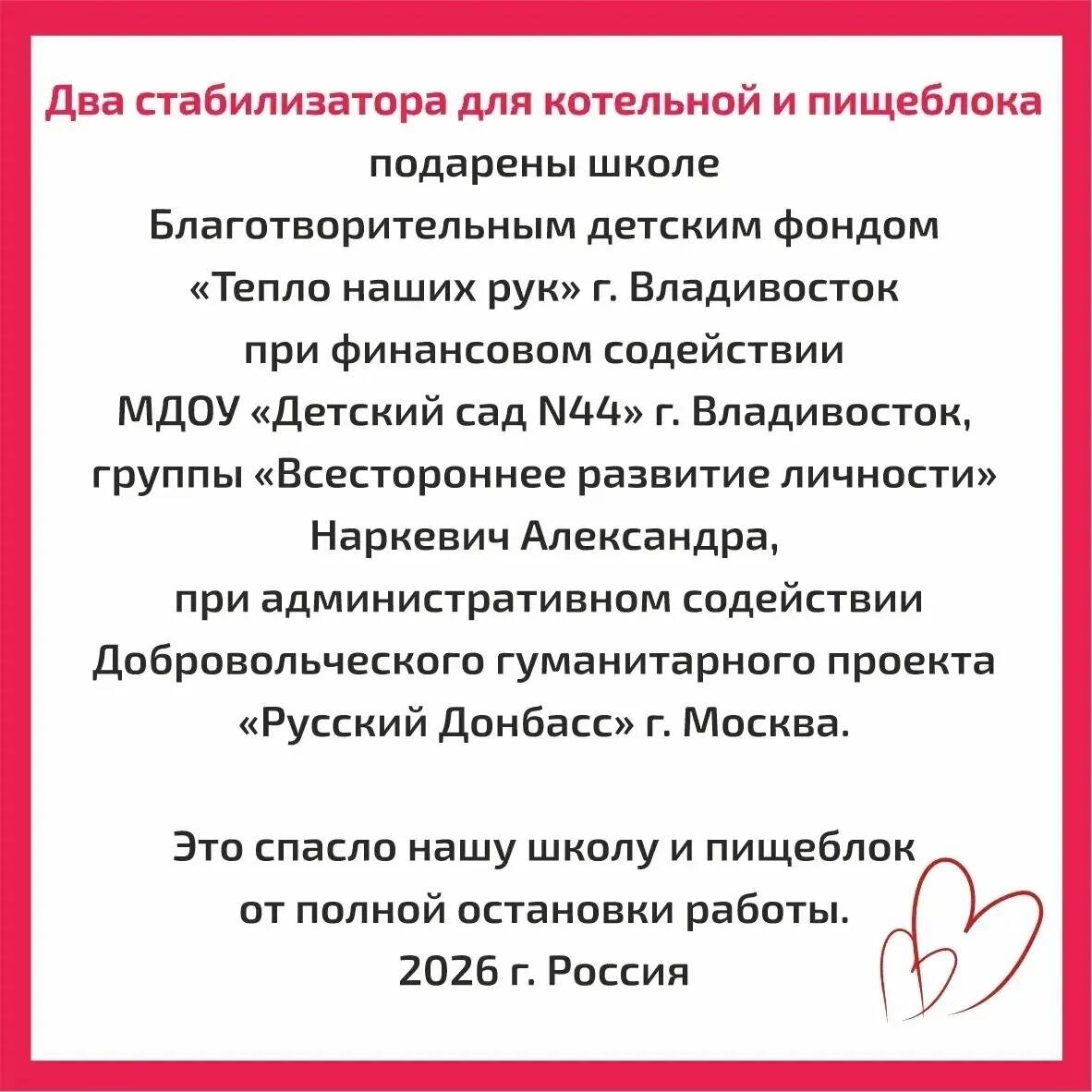 И это — результат нашей совместной работы! Благодаря оперативной помощи друзей из Владивостока — благотворительного фонда «Тепло наших рук» и его руководителю Ирине Наркевич — школа была своевременно обеспечена стабилизаторами. Теперь отопительная система работает бесперебойно. Дети продолжают учиться очно ! Знаете, что самое трогательное в нашей работе? Когда помощь превращается в цепочку добра. Один из стабилизаторов, который обеспечивает это тепло, — особенный. Его помогли купить… воспитанники и родители детского сада №44 из Владивостока! Представьте: дети с Дальнего Востока поддержали детей на юге Новороссии. Это ли не чудо? А ведь это только часть большой истории! Вместе с фондом «Тепло наших рук» Владивосток взяли шефство над этой школой весной, и за полгода удалось сделать очень многое: ✅ Полностью оборудован современный пищеблок. ✅ Отремонтирован и оснащен швейный класс. ✅ Закуплены новые учебники, в том числе по истории. ✅ И теперь — решен вопрос с теплом. Отдельная благо