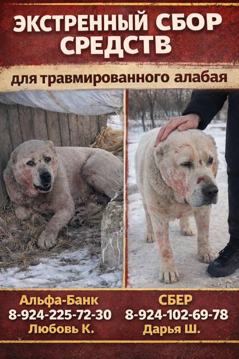 *ВЕЗУТ В КЛИНИКУ ПРЯМО СЕЙЧАС!* Что именно произошло, мы пока не знаем. По предварительным признакам, возможно, на неё напали другие собаки. срочно нужна ветеринарная помощь, обследование, лечение и обезболивание. Без нашей с вами поддержки ей просто не справиться. Пожалуйста, не проходите мимо. Даже самая небольшая сумма имеет значение. Если не можете помочь финансово — сделайте репост, расскажите другим, помогите распространить информацию. Реквизиты для помощи: Альфа-Банк: 8-924-225-72-30 — Любовь К. Сбер: 8-924-102-69-78 — Дарья Ш. Пометка благотворительность 🙏 Спасибо каждому, кто откликнется. Ваша доброта сейчас может спасти жизнь.