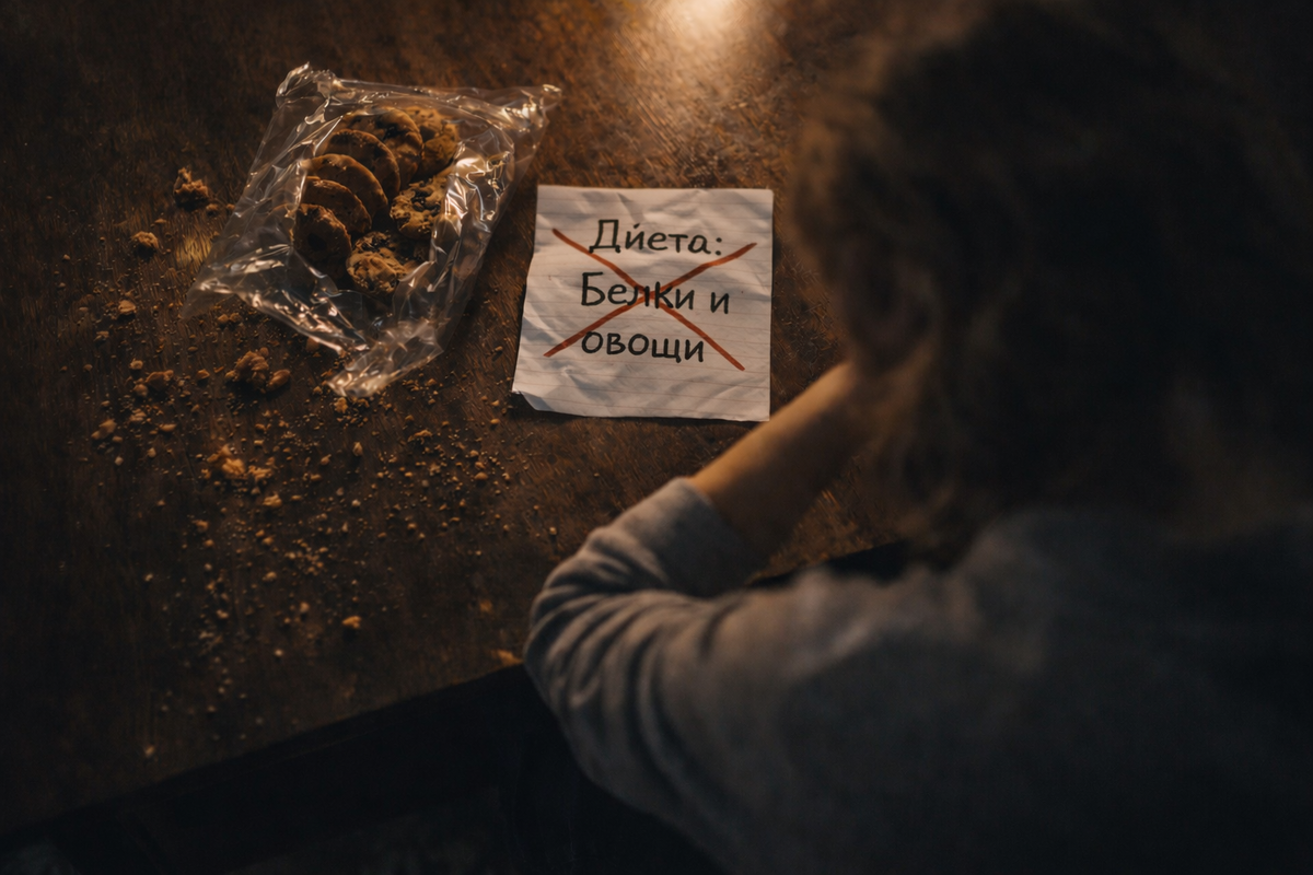 Вечер пятницы. Вы сидите на диване, в руках пакет печенья, а в голове — гулкое эхо поражения. Опять. Утром был твердый зарок: только белок и овощи. Но к вечеру реальность внесла правки, и кажется, будто кто-то другой, голодный и злой, опустошил холодильник за вас. Знакомо? И дело не в «слабой воле» или лени. Просто когда мозг кипит после рабочего дня, а батарейка на нуле, тело переходит в режим выживания. Оно требует быстрого топлива. А потом накрывает липкое чувство вины, сравнение себя с «успешными атлетами» из соцсетей и дежурное обещание начать с понедельника. Круг замкнулся. Результат — ноль. Ваш организм — не враг, а очень старый и осторожный механизм. Резкие ограничения он считывает как сигнал бедствия: Режим защиты. Когда вы вычеркиваете целые группы продуктов, тело включает режим «голодной зимы» и выкручивает тягу к еде на максимум. Это не каприз, это биология. Наказание вместо заботы. Если еда превращается в штраф за лишний вес, психика рано или поздно поднимет бунт. Отсутств