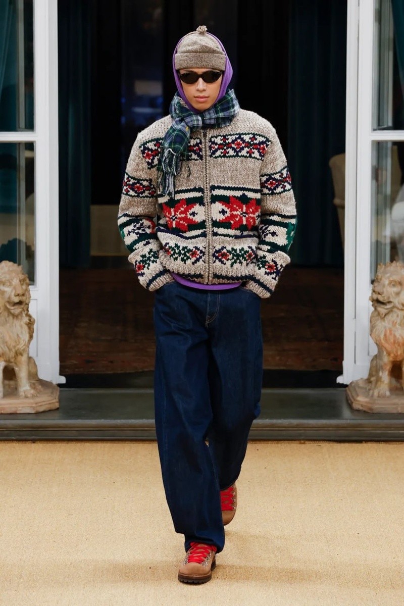 Первая мысль при взгляде на показ Ralph Lauren — хочется забрать эти узорчатые свитеры и зипки, вторая: как ловко он умудрился сочетать в