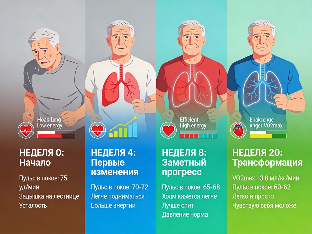 Утром, когда просыпаетесь, посчитайте пульс. Через две недели он будет на 2–3 удара в минуту ниже. Это означает, что сердце начало работать эффективнее. Подняться по лестнице станет легче