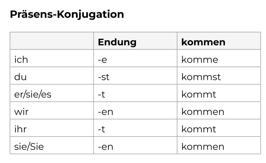 Чтобы образовать Präsens (настоящее время), мы берем основную форму глагола (инфинитив), убираем окончание -(e)n и добавляем личные окончания: