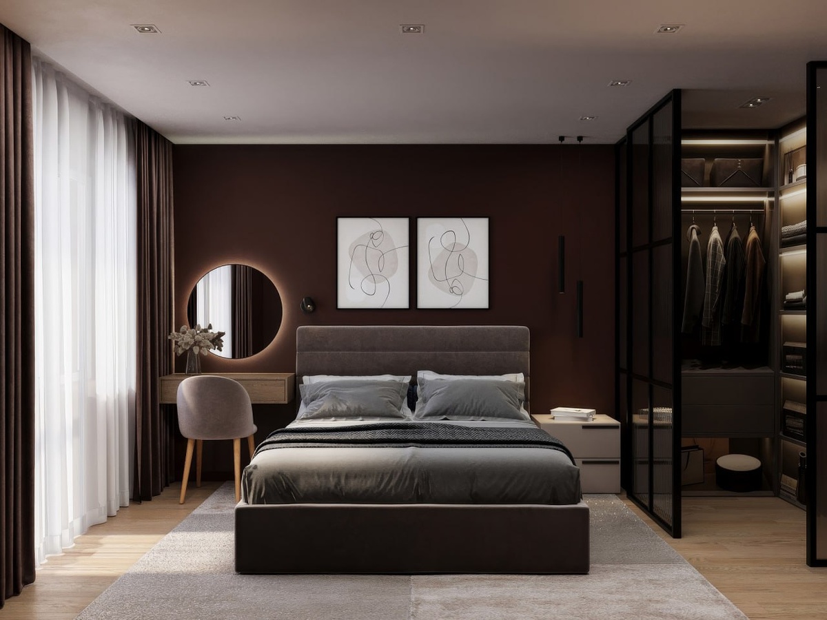 : «Сделать гардеробную в спальне, но при этом не потерять пространство, свет и ощущение уюта». В таких случаях важно найти баланс: чтобы спальня оставалась лёгкой, светлой и уютной, дополнительные элементы должны быть подобраны и интегрированы максимально деликатно. 📎 Сегодня хотим показать на примере наших архивных проектов, как можно аккуратно встроить гардеробную в спальню — чтобы не было ощущения тесноты и перегруженности. ✅ Спальня 14,5 кв. м (трёхкомнатная квартира, г. Одинцово) В этом проекте спальня компактная, поэтому было важно не «достраивать» лишние объёмы и не утяжелять пространство. 🟢Мы выделили угол справа от кровати и сформировали гардеробную с помощью стеклянных перегородок — без капитальных стен и сложных конструкций. 🟢Внутри предусмотрели освещение и продуманную систему хранения, которая идеально встала по габаритам. Стеклянные перегородки сыграли ключевую роль: они сохранили ощущение воздуха и света, при этом создали приватную зону, логично отделённую от сп