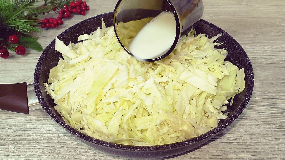 Заливаем капусту молоком и ставим на плиту, доводим до кипения, убавляем огонь и тушим под крышкой до готовности (примерно 50%). Это займёт 7-10 минут.