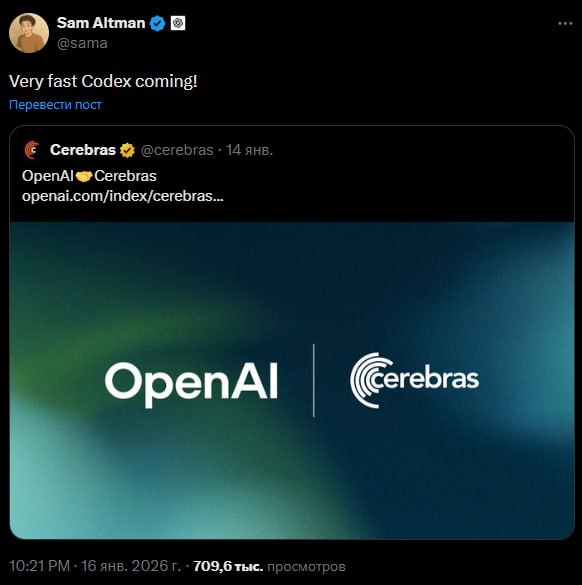 🤖 OpenAI объявила о партнёрстве с Cerebras, чтобы добавить в свою платформу 750 МВт «ультранизколатентных» вычислений для инференса моделей. Это означает ускорение задержек в сценариях вроде генерации кода, создания изображений и работы AI-агентов, где важен цикл «запрос - вычисление - ответ» в реальном времени. Многолетнее соглашение на развёртывание 750 МВт начнет воплощаться в жизнь уже в этом, 2026 году и будет идти в несколько стадий. Мощности будут подключаться «траншами» вплоть до 2028 года. На этом фоне Сэм Альтман написал в X: «Very fast Codex coming!» - поверим ему, скорости кодексу добавить бы не помешало. #openai #codex #chatgpt
