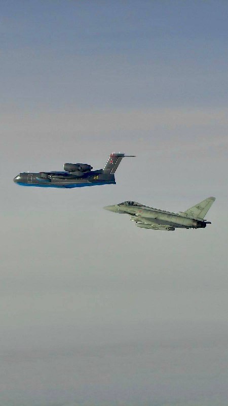 Самолёт-амфибия Бе-200ПС (бортовой номер «21 желтый») МА ВМФ РФ в сопровождении Eurofighter Typhoon ВВС Италии над Балтикой, 2026 год.