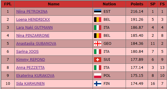 Программа получилась, смотреть было интересно и можно выразить только восхищение скоростью восстановления Нины после травмы, а ей ведь уже 21 год. Каскад 3+3 она не исполняла, что в силу существующих правил было не обязательно - максимальные 7 тройных прыжков легко собрать и без него, добавив тройной тулуп к двойному акселю. Оценивали Нину, как лидера, т.е. весьма комплиментарно (техника в ПП 76! баллов), в компонентах ей впервые в карьере поставили девятки, на финальном тройном сальхове судьи простили недокрут, все непрыжковые элементы получили 4й уровень и в результате на табло загорелась итоговая сумма в 216 баллов, а это 6й результат сезона в Мире ISU после японок и Алисы Лью.